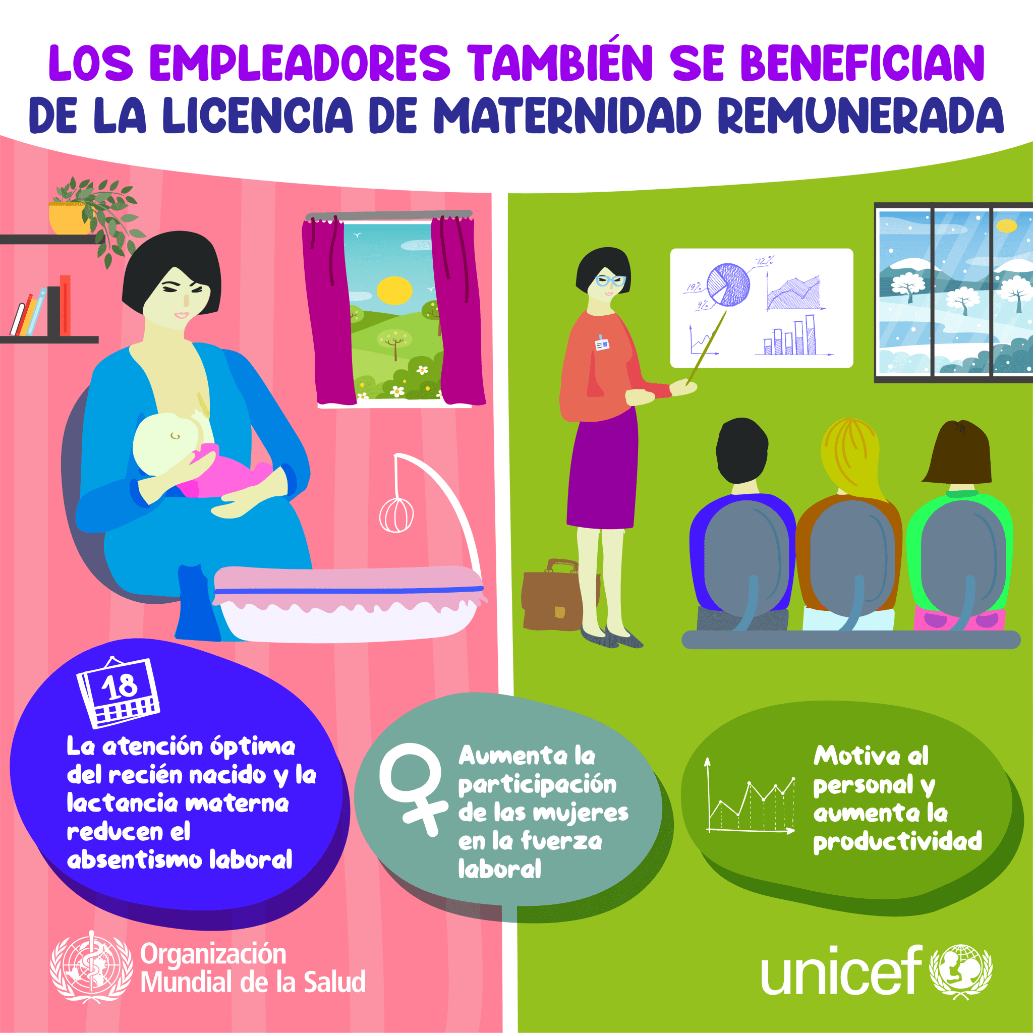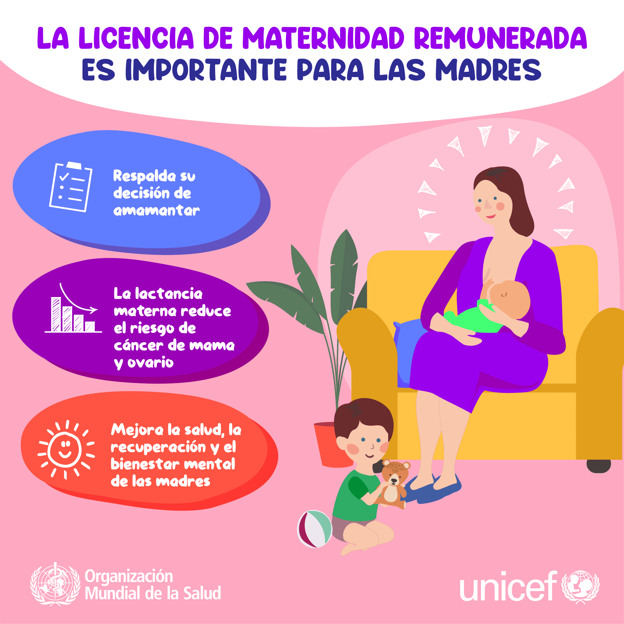 Las medidas de protección de la maternidad efectivas mejoran la salud de los niños y las mujeres y aumentan la lactancia. Desde la OMS y UNICEF sostienen que al hacer que sea posible amamantar y trabajar, las sociedades funcionan mejor. La lactancia materna ofrece a los niños beneficios nutricionales y de salud fundamentales con efectos positivos duraderos para toda la vida, y contribuye a mejorar la salud de las poblaciones –y de la fuerza de trabajo– para el futuro.